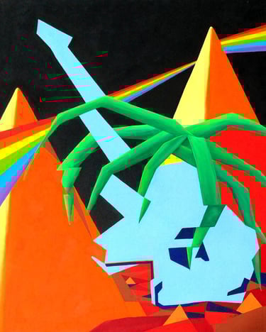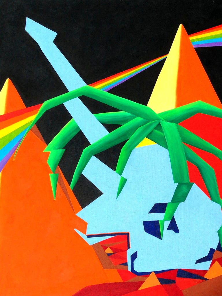 My painting 'The Heavy Sound of Light' (60 x 50 cm) is a kind of self portrait, composed in a cubist style, consisting of personal influences represented by inanimate objects involving culture and inclusion, music and the environment, and a living plant that, apart from possessing aesthetic beauty, plays a fundamental role in the sustainability of life such as cleansing the air of carbon emissions and other greenhouse gasses. The awe-inspiring spectrum of colour is created through a prism of light that shines brighter than ever from a lighless sky. The fractured nature of the composition is perhaps symbolic of today's climate.