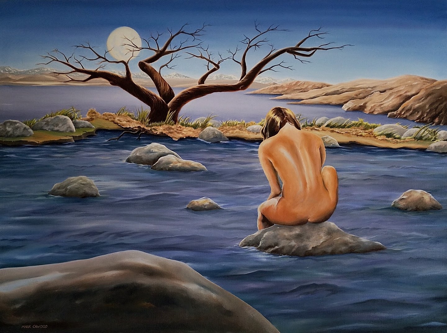 The tree branches have lost their leaves whilst the river flows from melting snow-capped mountains, implying a warm winter climate. The figure is at one with nature, immersed deep in thought whilst contemplating nature's innate wisdom and guidance.