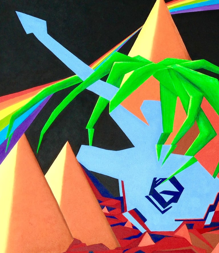 My painting 'The Heavy Sound of Light' (60 x 50 cm) is a kind of self portrait, composed in a cubist style, consisting of personal influences represented by inanimate objects involving culture and inclusion, music and the environment, and a living plant that, apart from possessing aesthetic beauty, plays a fundamental role in the sustainability of life such as cleansing the air of carbon emissions and other greenhouse gasses. The awe-inspiring spectrum of colour is created through a prism of light that shines brighter than ever from a lighless sky. The fractured nature of the composition is perhaps symbolic of today's climate.